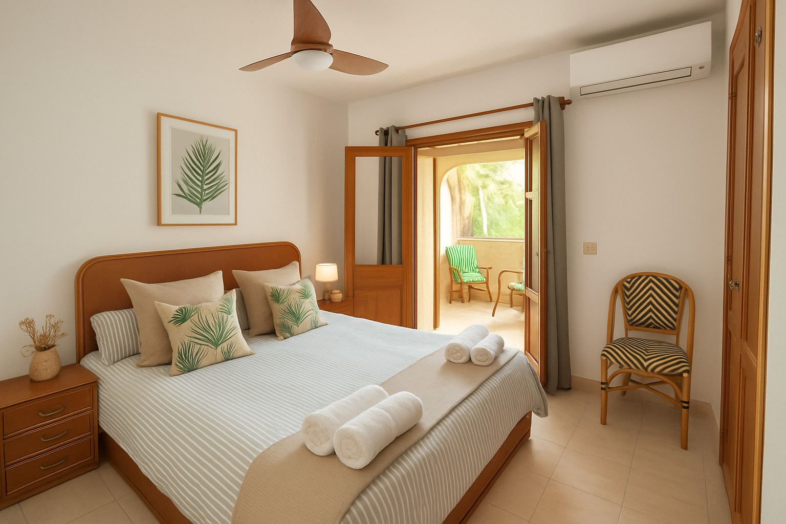 2 dormitorios con aire acondicionado y ventilador de techo (uno de ellos con terraza privada, mesa y sillas de mimbre con vistas al jardín y la piscina comunitaria)