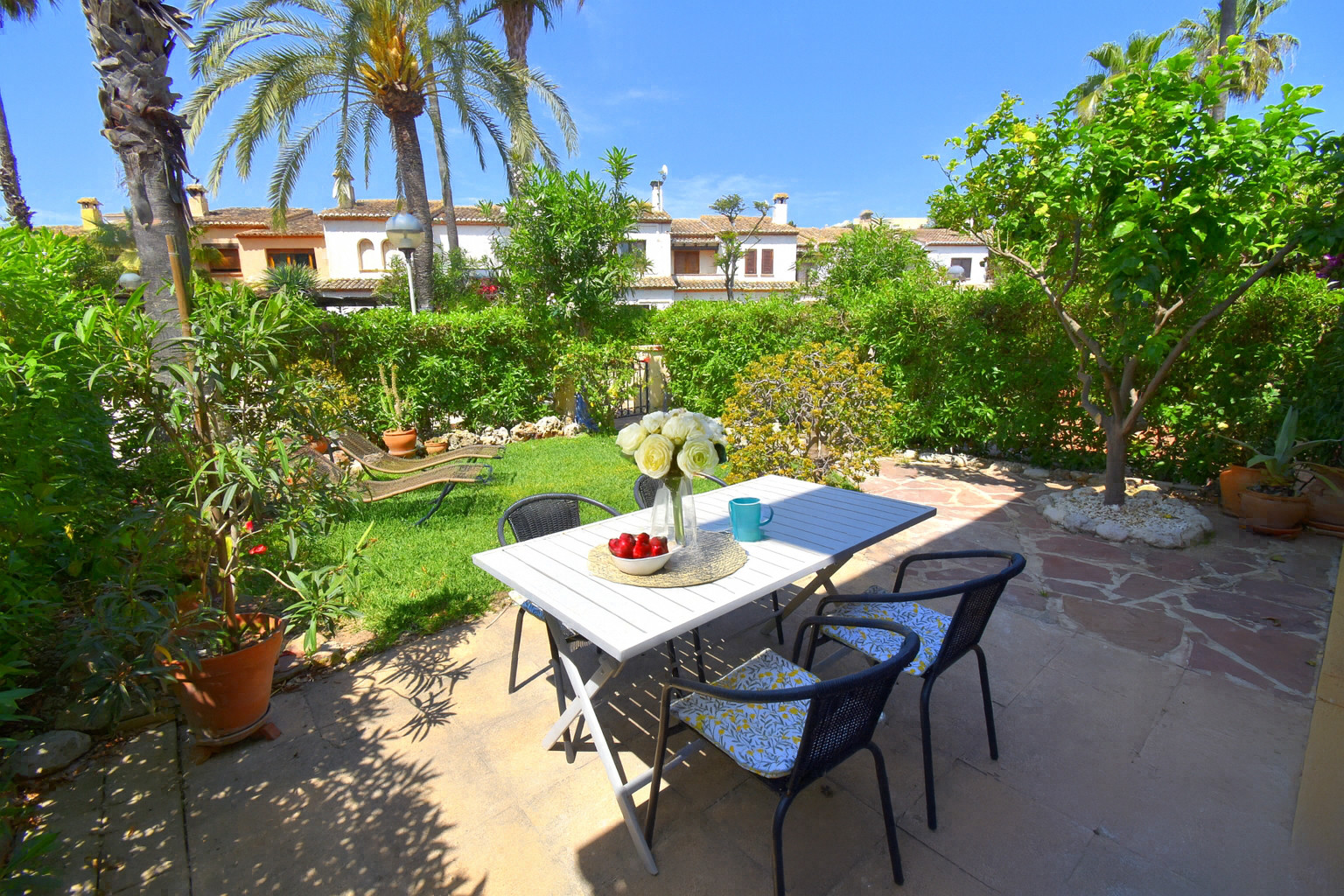 Casa Rosa dispone de un jardín privado con terraza amueblada, 2 tumbonas, toldo, y césped, ideal para relajarse al sol o disfrutar de comidas al aire libre.