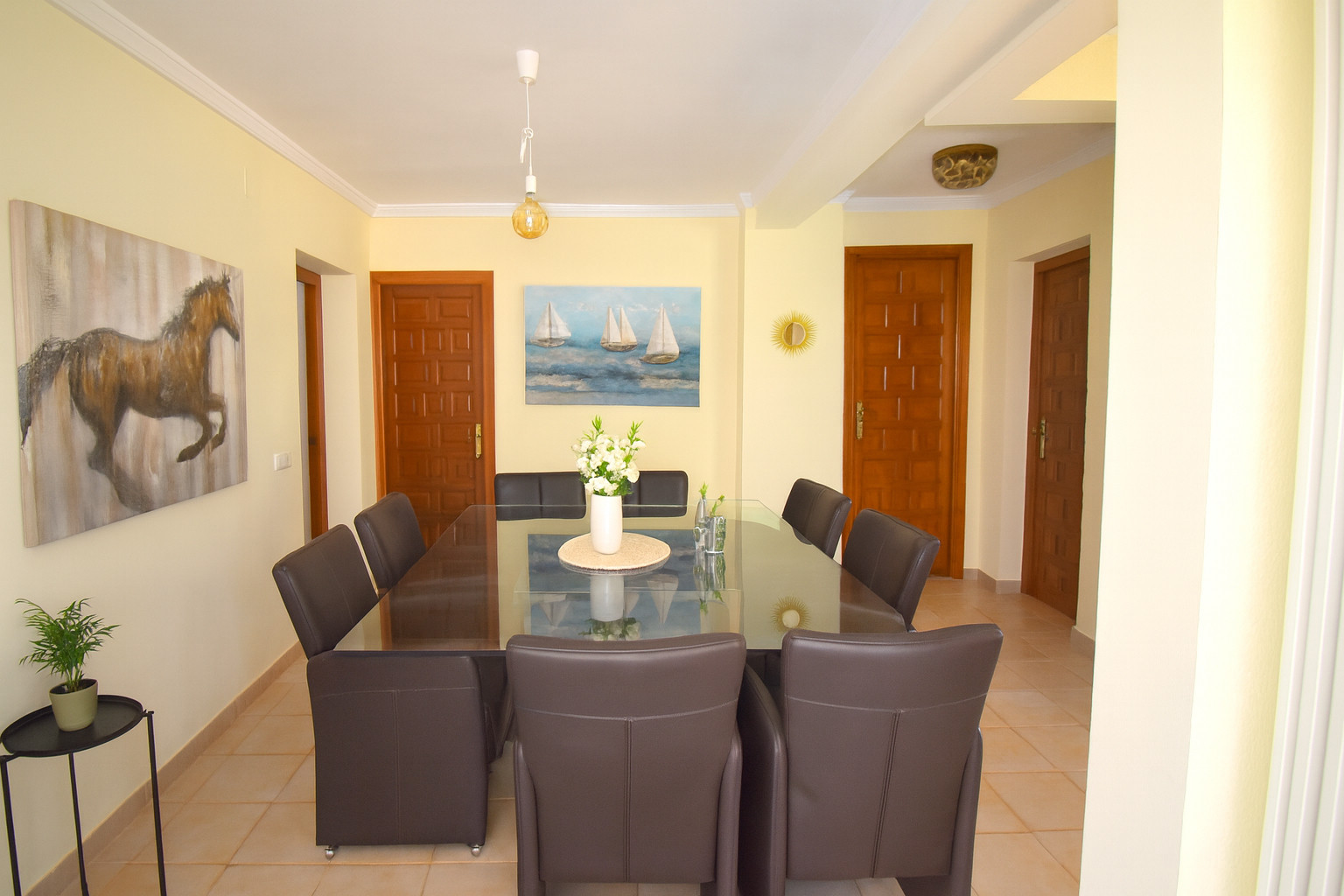 Desde el salón, se puede acceder a la terraza cubierta, equipada con sofás de mimbre, y a la terraza exterior con una mesa, 8 sillas y toldo, desde donde se pueden disfrutar vistas al mar a lo lejos.